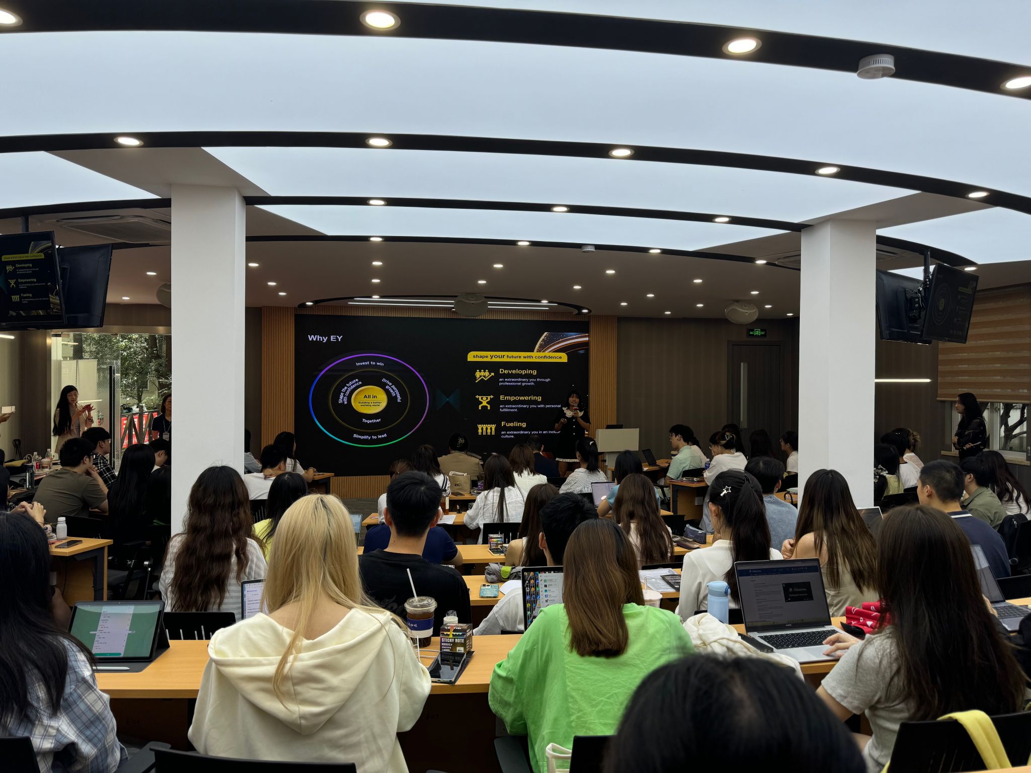 2025年9月25日10:00,2025安永秋季校园招聘暨寒假实习生校园宣讲会在全讯800cc大白菜嘉定校区文德楼101顺利举行。本次活动共吸引约140名同学前来参加,由来自人力资源部部门的 Stella Ren主持,出席嘉宾包括税务合伙人Derrick Chen,高级审计经理Peggy Zhou和人力资源部Vivian Lu。宣讲会共分为4个环节,分别是走进安永、体验安永、加入安永和贴士大放送。 宣讲会开始前,Stella和Vivian分别为提前到来的同学做了简历一对一咨询和解答。 活动伊始,Derrick和Peggy为在座的同学们以讲故事的方式从AI与数字化的角度介绍了安永会计事务所的概况、工作方向和核心优势。Derrick从他所在的税务部门出发,详细介绍了安永税务在合规咨询、国际并购重组、间接税服务等领域的核心业务,深刻剖析了他所在的税务团队AI转型所带来的技术革新,展现了安永作为“数字智慧化先行者”的一站式税务服务能力。同时,他回顾在了他在专业机构的职业历程,指出税务领域因AI应用发展快、专业价值高的特点,也坦诚该行业存在高压节奏,提醒我们同学要注意夯实工作基本功。 Peggy以自身职业经历为引,分享了在审计领域的洞察。她给同学们讲解了安永审计业务全景,涵盖外部审计、财务会计咨询等多元板块。同时,衔接Derrick分享内容,阐述了数字化对审计的革新,如数字化智能审计方案,各类AI工具如EY Canvas AI、智能问答机器人等在信息处理、流程自动化、专业答疑等场景的应用有效的助力审计效率提升。此外,还介绍了安永咨询业务的多元布局,包括管理咨询、科技咨询等领域,凸显其在科技、创新、人才方面的核心优势,给同学们呈现了安永在审计与咨询领域数字化转型与专业服务的全景图景。 紧接着,Derrick对安永的职业发展路径进行了深入解读,通过清晰的阶梯式成长图示,向同学们展示了在安永稳步发展、前景可期的职业模式。安永为员工提供多元化的热门课程吸引了同学们的目光,其涵盖数据集成、AI加速项目、金融、供应链与运营管理、机器人工程以及网络安全AI等领域,帮助在职人员在新兴技术、领导力和商业洞察等方面获得更深层次的理解与实战经验。 对于如何加入安永,Stella详细介绍了应届毕业生与审计实习生的招聘流程。从网申时间、在线测评、面试环节、录用通知、培训训练营到正式入职共六个阶段出发,逐一强调了关键时间节点与具体安排。针对表现优异的同学,安永还推出了精英计划(审计及税务方向),旨在为安永培养和储备具备全球视野与数字化创新能力的未来人才。 在最后的问答环节,Stella就常见问题进行了集中解答,从网申技巧到面试策略均提供了宝贵有效的建议,帮助同学们提升申请成功率。随后的互动答疑中,Derrick和Peggy热情回应了同学们的提问,内容涵盖不同专业背景如何匹配安永的岗位需求,以及为顺利就业应提前培养的核心能力等。他们建议同学们在日常学习中注重基础能力的积累,养成良好的学习习惯,不断总结经验,以更好地适应未来职场的挑战。同时,两位嘉宾还鼓励大家在面试中保持自信,在工作中主动思考,从而从容应对职业发展。整个答疑过程轻松愉快,同学们积极参与,收获颇丰。 至此,安永2025-2026秋季校园招聘与寒假实习生宣讲会顺利收官。本次活动不仅帮助同学们切身感受到安永别具一格的创新氛围和开放包容的企业理念,也让大家清晰认识到当今职场所需人才模式。我们热切盼望更多怀揣相同理想的同学加入安永这个集体。在这里,每位同学都将迎来丰富的成长机遇,获得施展才华的广阔平台,携手书写职业道路上激动人心、勇于突破的全新旅程! 800全讯白菜网外联部 |